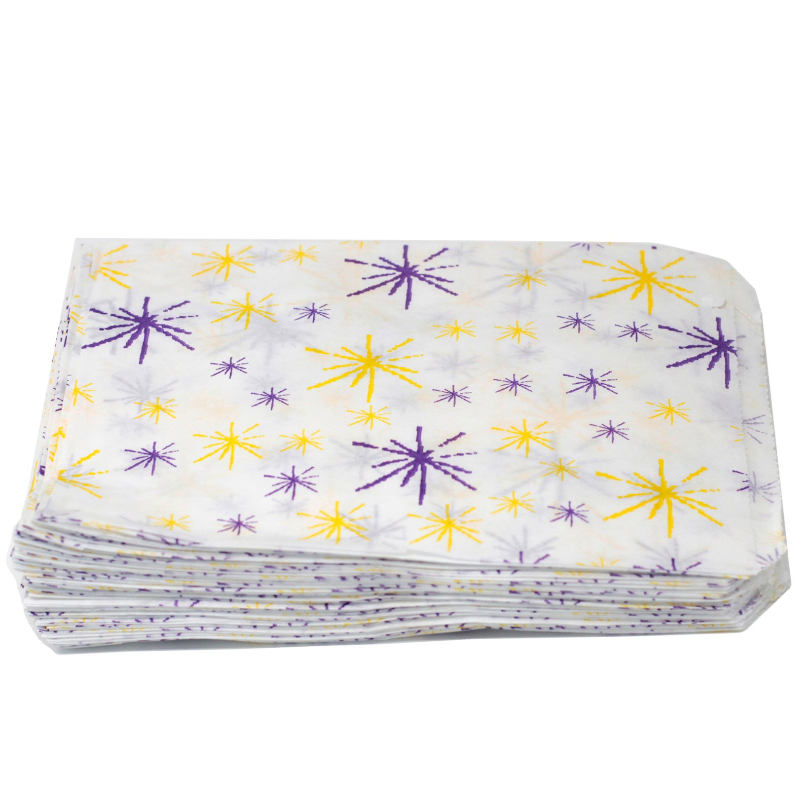 This paper bag with a printed starburst design is perfect for a wide range of small gifts, cosmetics, food and greeting cards.