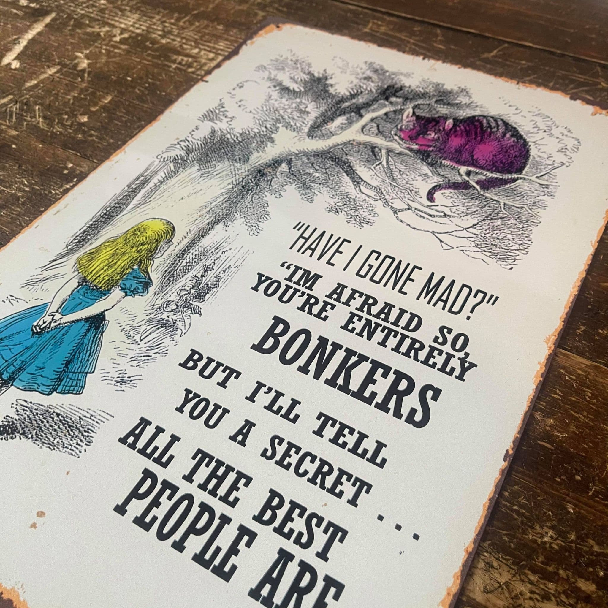 Alice in wonderland , Have I Gone Mad , Entirely Bonkers - Metal Advertising Wall Sign