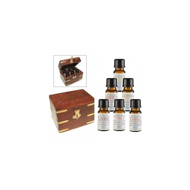 Each fruity fragrance oil gift box contains a 10ml bottle each of blackberry, cherry, cranberry, grapefruit and kiwi, summer fruits and orange plus the vintage looking wooden storage box.