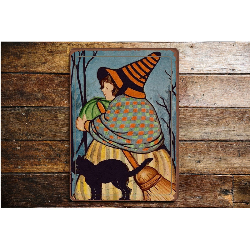 Halloween Witch Black cat - Metal Vintage Wall Sign