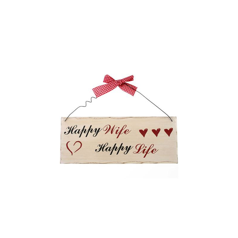 This plaque is decorated with red love hearts and black letters that read ‘Happy Wife Happy Life’.
