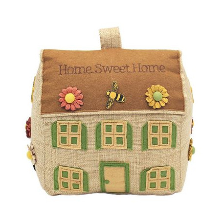 This beautiful rustic country style doorstop, is shaped like a house and decorated with flowers, bees, and ladybirds.