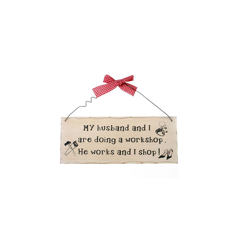 This plaque is decorated with tools and ladies’ accessories and black letters that read ‘My husband and I are doing a workshop.