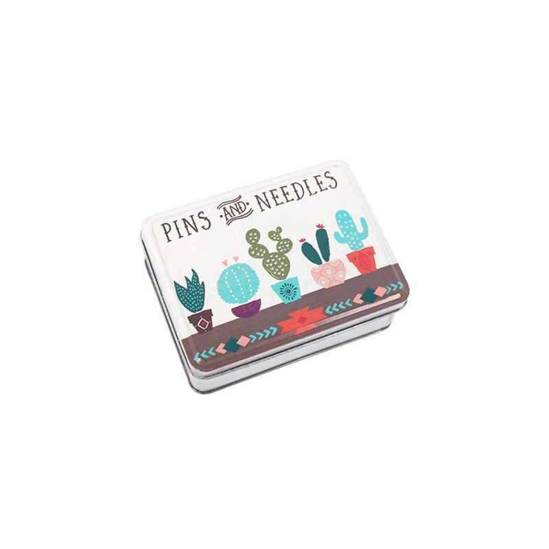 This quirky looking tin is made with a design of a white and brown background, with five various types of cacti painted onto it, giving it a quirky and rustic effect, the words read at the top: "Pin's and Needles' .
