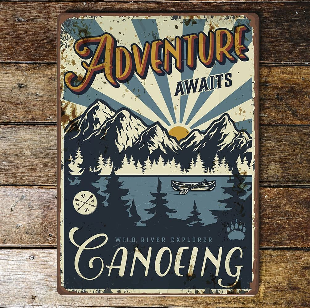 Retro Adventure Awaits Canoeing - Metal Wall Sign Plaque