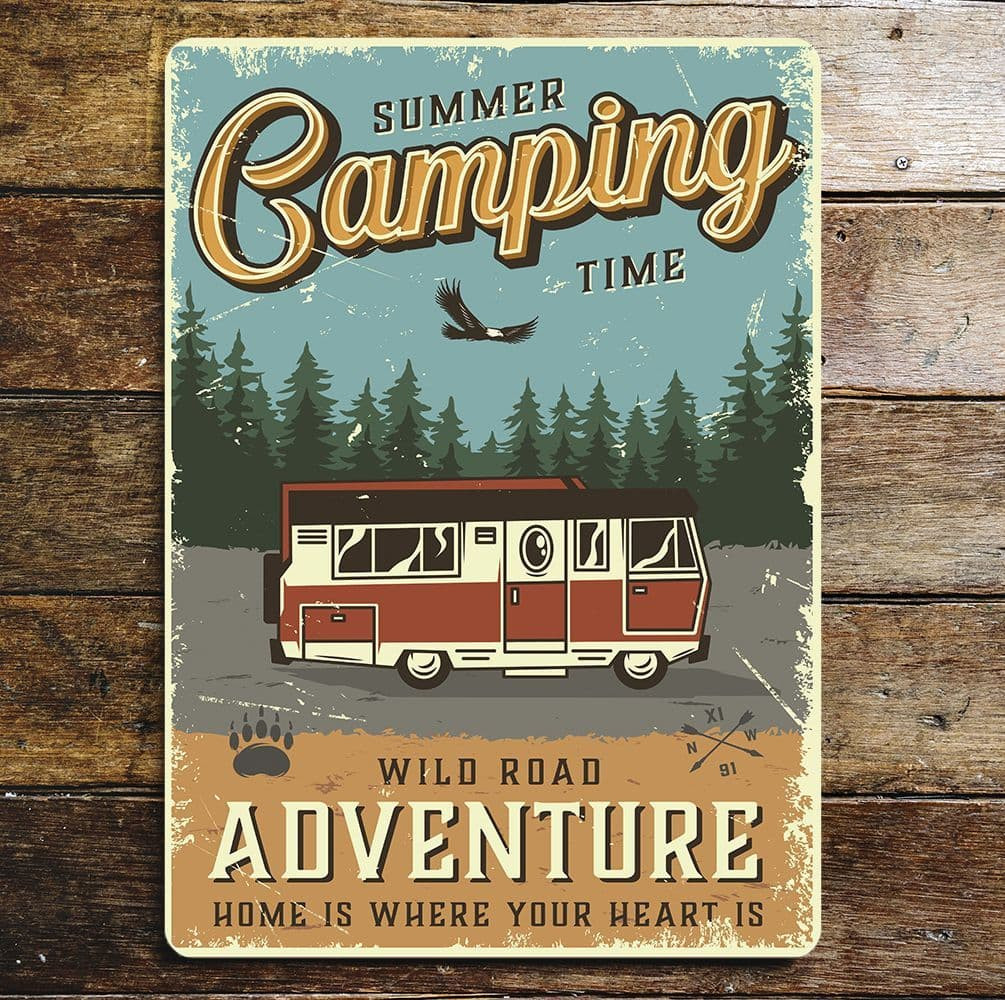 Retro Summer Camping Time Adventure - Metal Wall Sign Plaque