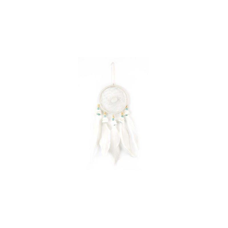 This beautiful and delicate white dream catcher is unique with its pale blue beads and white seashell decoration finished off with white feathers.