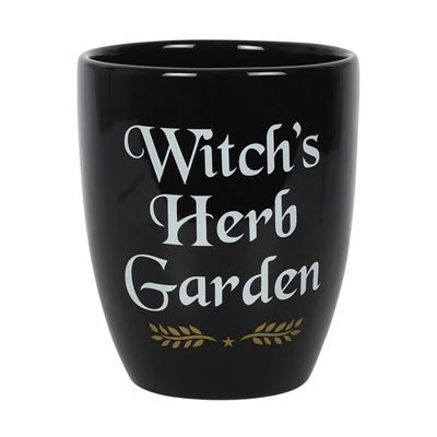 This ceramic plant pot features 'Witch's Herb Garden' text accented by a simple leaf design.