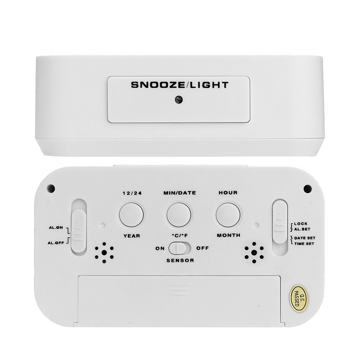 5.3 Inch Smart Simple Silent LED Digital Alarm Clock w/ Date Temp Display -White. Move the button in the back to set the set time, date, alarm, and snooze intervals. Sensor automatically comes on when itand#039;s dark around, because itand#039;s light-activated. Itand#039;s soft, making you sleep easily or see time from a distance hands free.