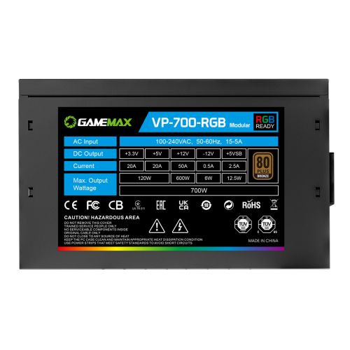 GameMax 700W VP-700W Black RGB PSU, Semi Modular, RGB Fan, 80+ Bronze, Eco Switch, Power Lead Not Included