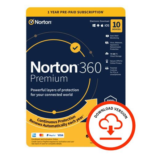 Norton 360 Premium 1x 10 Device, 1 Year ESD - Single 10 Device Licence via email - 75GB Cloud Storage - PC, Mac, iOS & Android *