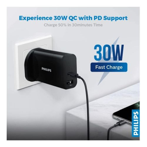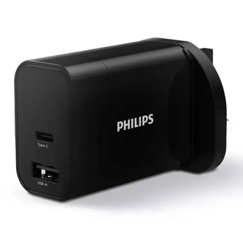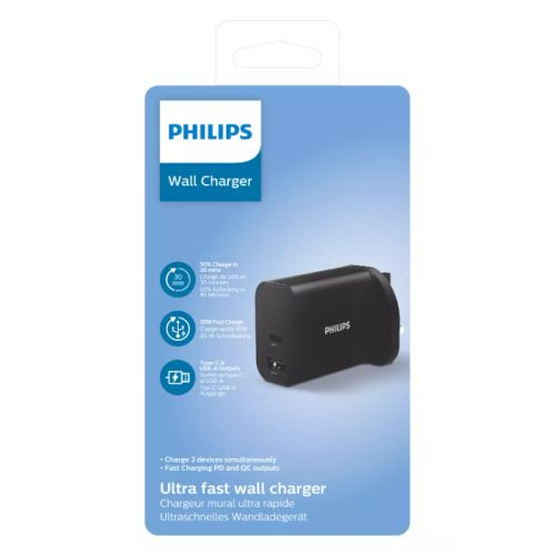 Philips 3-pin Wall Plug USB-C & USB-A Charger, 30W, Fast Charge, Power Delivery