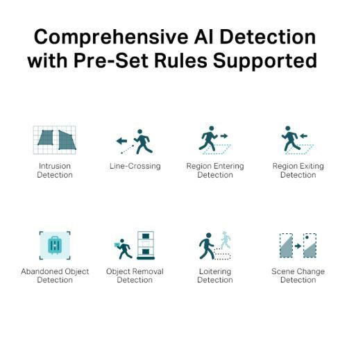 Human and Vehicle Classification, Area Intrusion, Line-Crossing, People, Vehicle, Region Entering, Region Exiting, Object Abandoned, Object Removal, Loitering