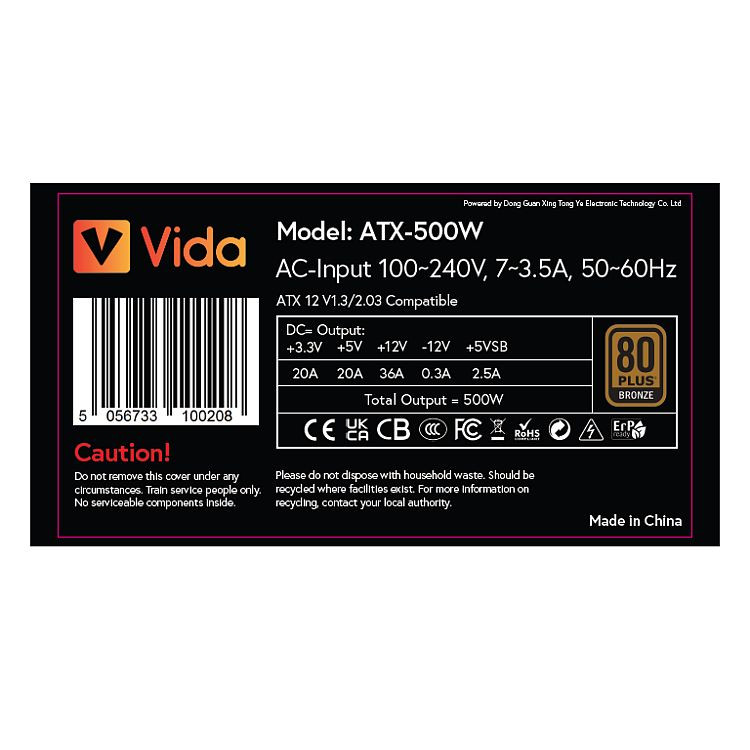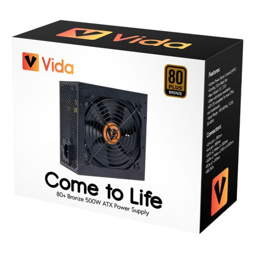 Vida 500W ATX PSU, 80+ Bronze, Fluid Dynamic Ultra-Quiet Fan, PCIe, Flat Black Cables, Power Lead Not Included
