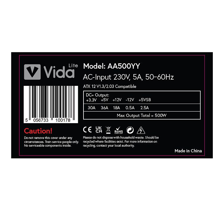Vida Lite 500W ATX PSU, Fluid Dynamic Ultra-Quiet Fan, Flat Black Cables, Power Lead Not Included