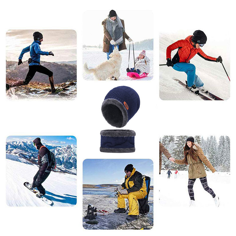 Beanie Hat Scarf Set Neck Cover Winter Warm Fleece Knitted Thick Ski Cap - Blue