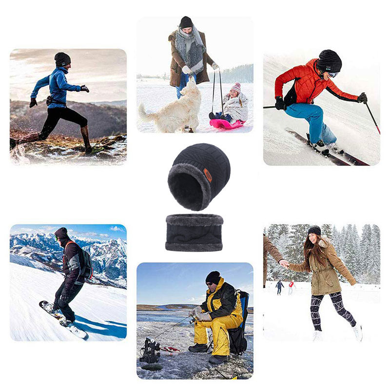 Beanie Hat Scarf Set Neck Cover Winter Warm Fleece Knitted Thick Ski Cap - Grey