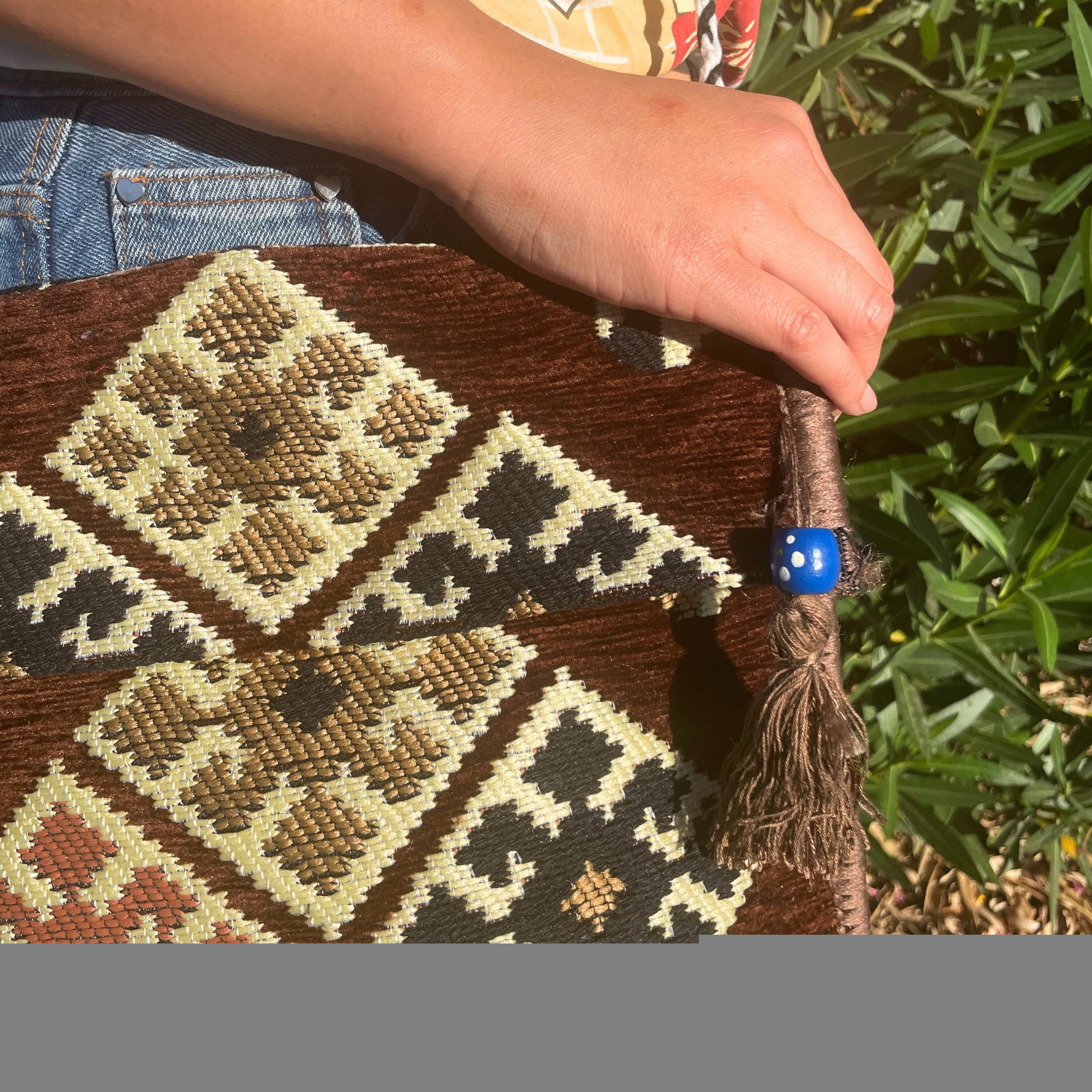 Chocolate Kilim Summer Bag. This exquisite piece combines the rich and warm tones of with the vibrant energy of a festival. Crafted through the ancient art of Kilim weaving in Turkey, it showcases intricate patterns that capture attention and evoke a sense of cultural heritage.