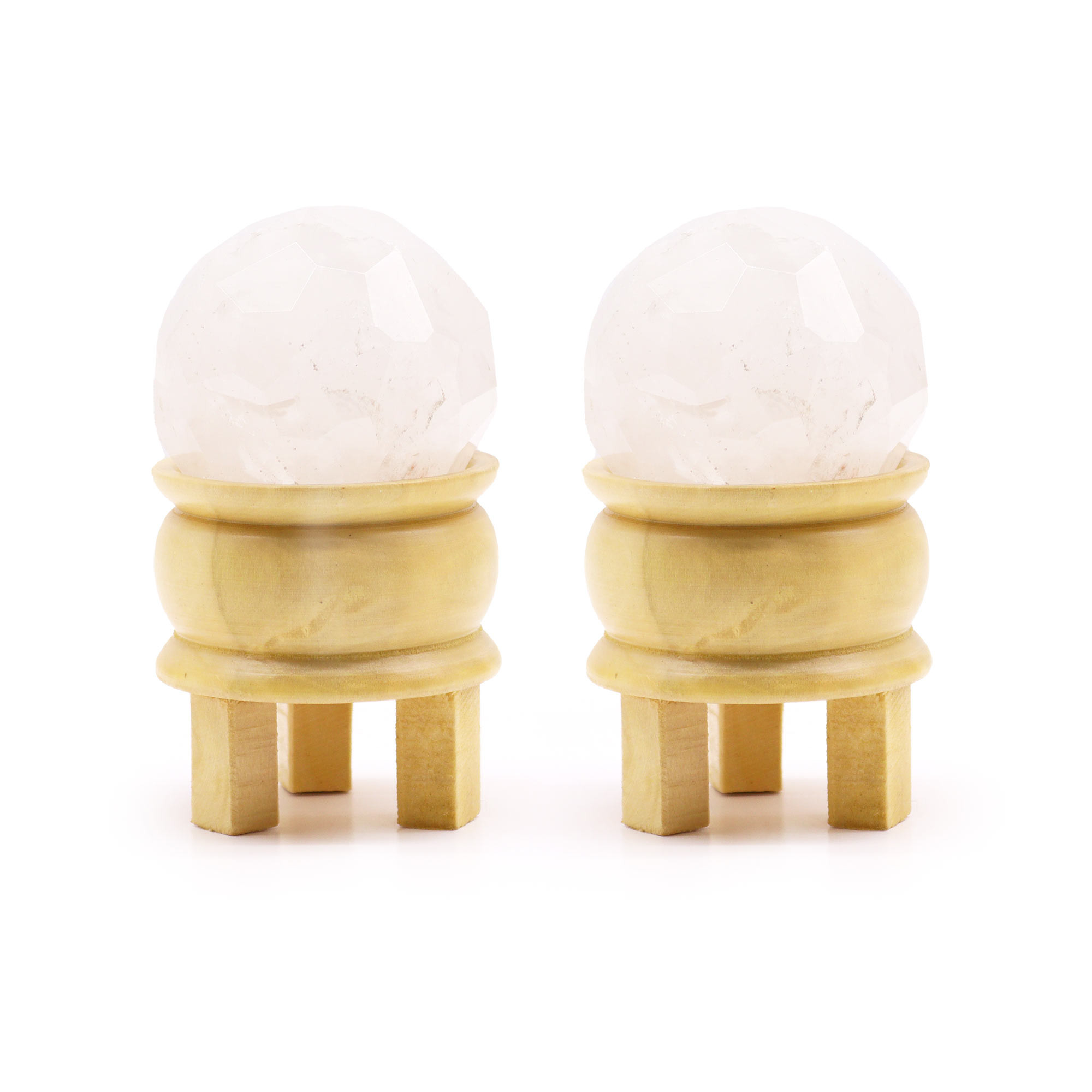 Rock Quartz Gemstone Faceted Healing Ball paired with a wooden stand in a light brown colour. This versatile gemstone sphere is a must-have for your store. It is believed that it enhances energies and intentions, making it ideal for energy healing, crystal grids, and maintaining a positive atmosphere. It's like a blank canvas for spiritual seekers and complements various esoteric practices.