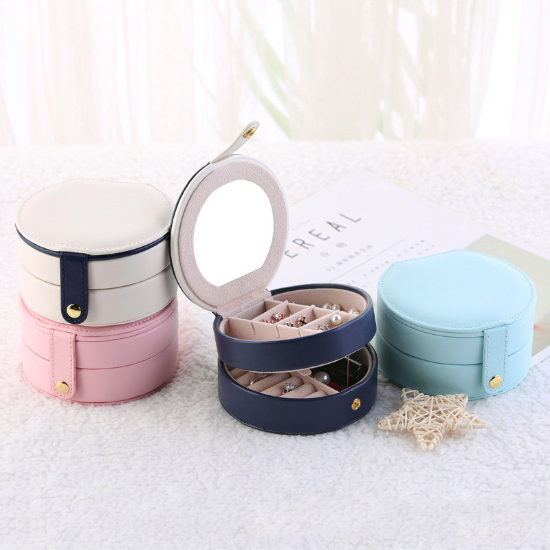 Round Jewelry Boxes Portable PU Leather Case 2 Layers Storage Organizer for Travel Home - White