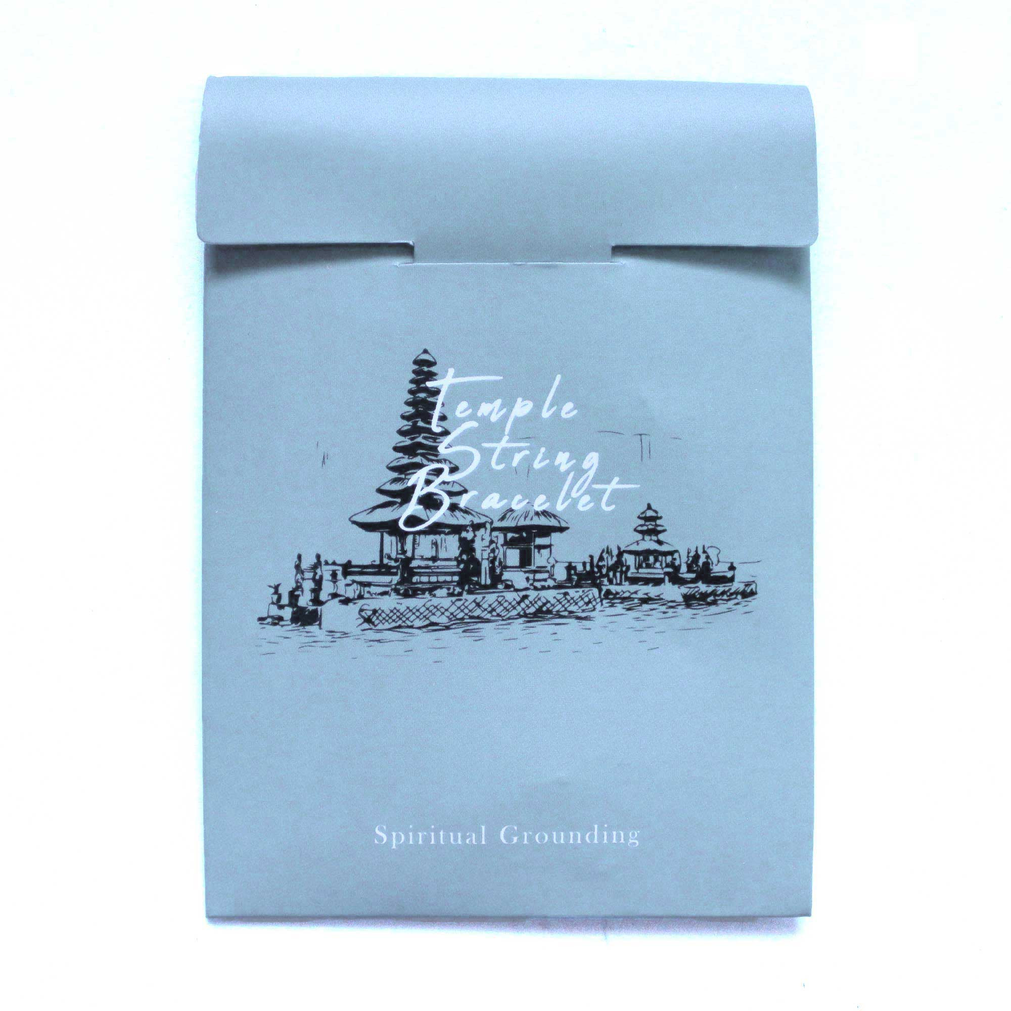 Each Temple String Bracelet - Spiritual Grounding is packed in a blue paper bag with a short description of its intention: