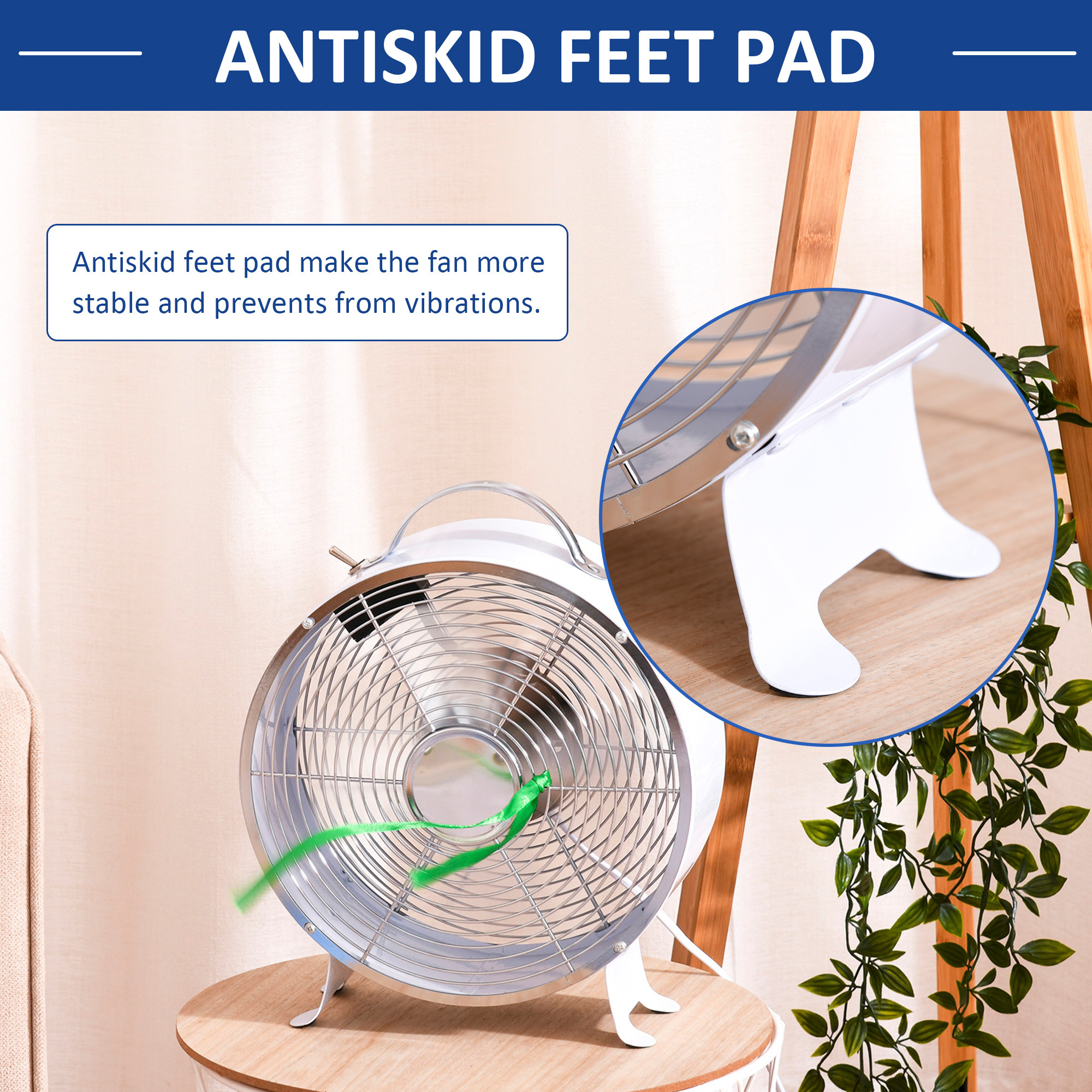 - Four non-slip feet: Keeps the metal fan stable when moving. Cooling fan dimensions: 31H x Ф26.5cm.