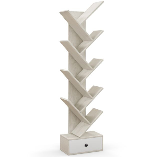 Its integrated back panel ensures a reliable frame, while the included anti-tipping kit will firmly fix the bookcase to the wall. What's more, it has 10 shelves in total and a large drawer. Each shelf can hold 5-10 books. Only occupying a corner space, the tree shelf can be placed in diverse occasions, such as home office, living room, bedroom, etc. Finally, the utility organizer shelves are very easy to assemble.