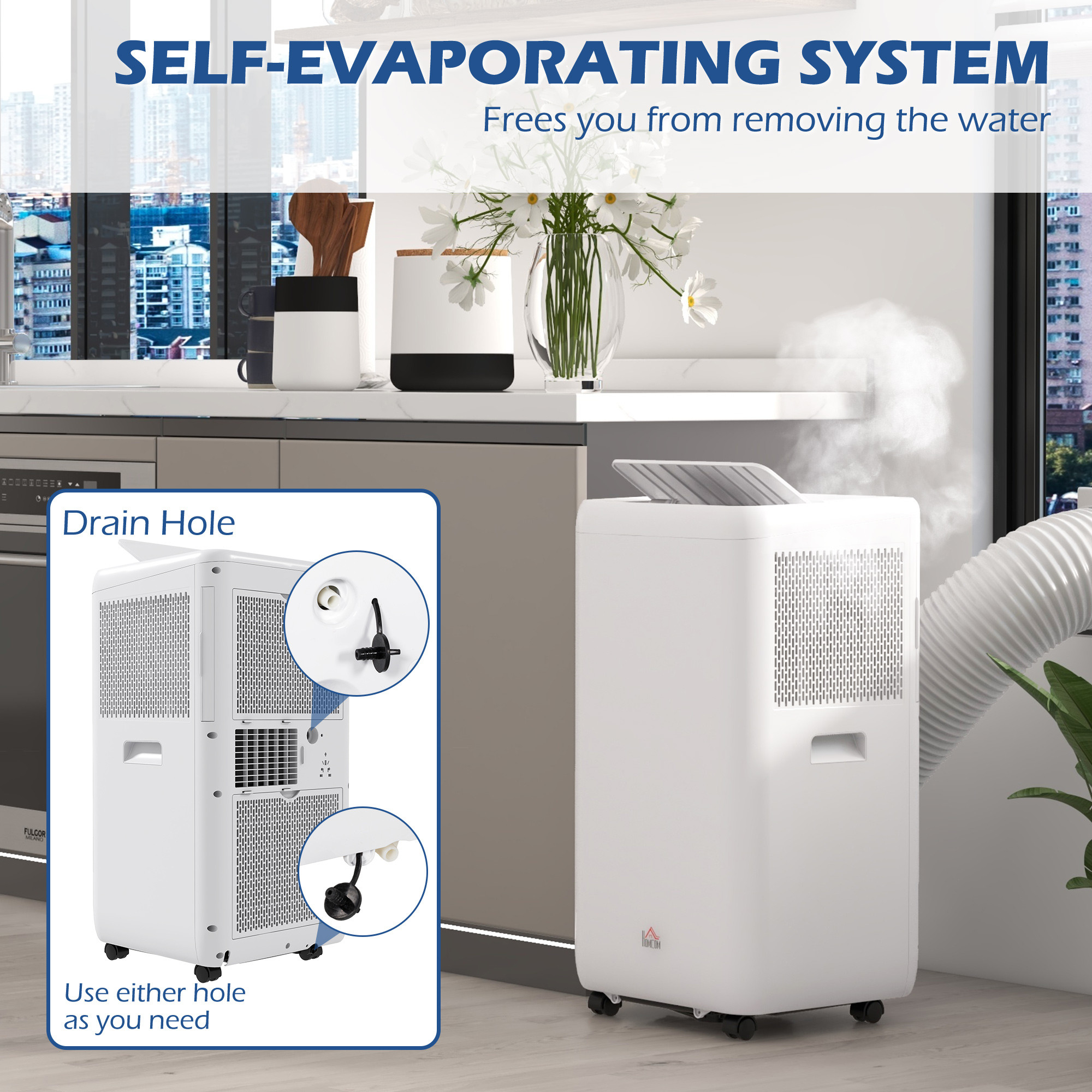 - Self-evaporating system: No need to keep emptying this portable air conditioner. Two drain holes in the middle and bottom, choose either as you need. Clean, ozone-friendly natural R290 refrigerant with removable and washable filter ensures fresh air for you. Suitable with sliding windows. Sliding window kit included.
