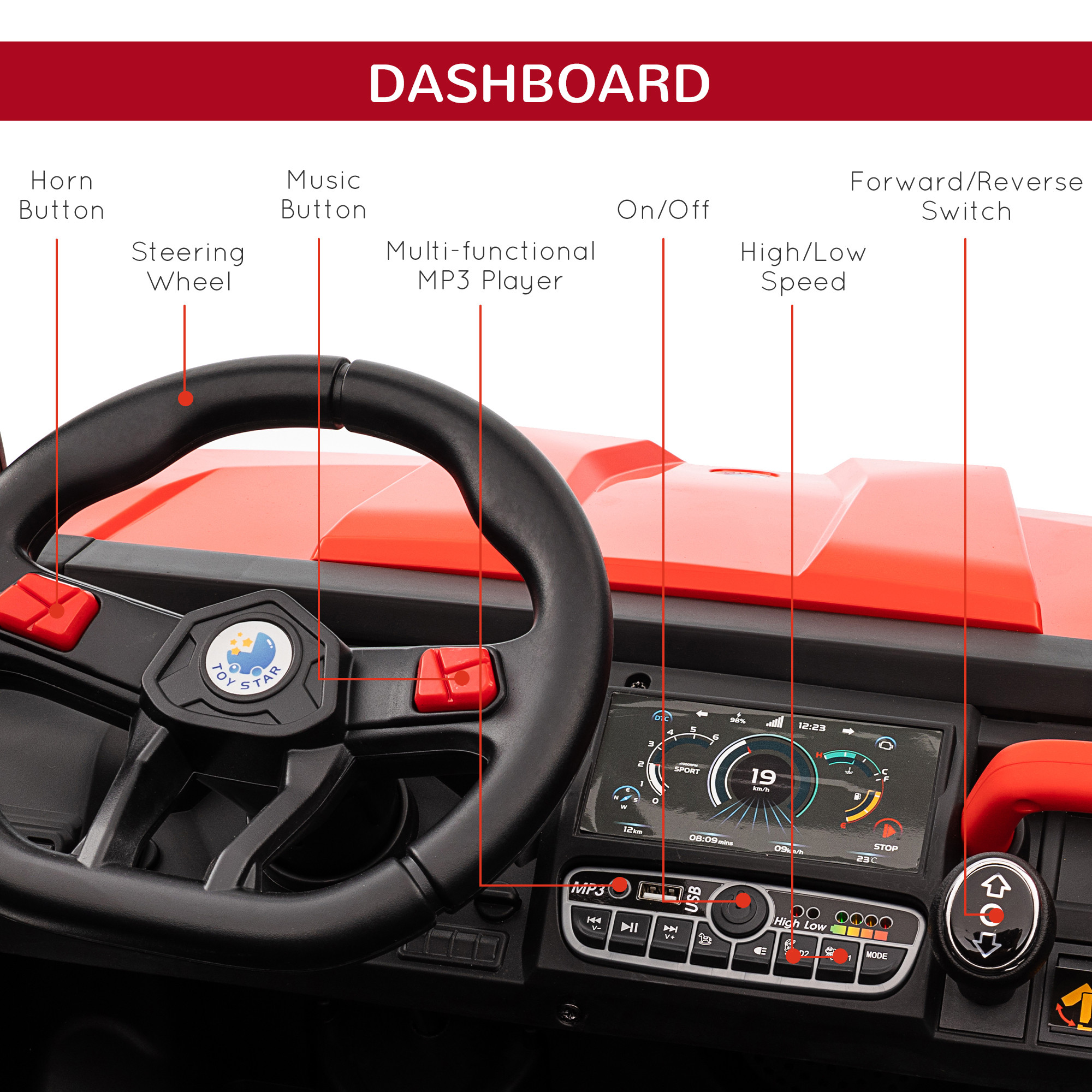- Realistic: This kids ride on car includes a music player, LED headlights, viewing screen and a working horn – everything you'd expect in a real vehicle. Also includes a back bucket for children to keep toys.