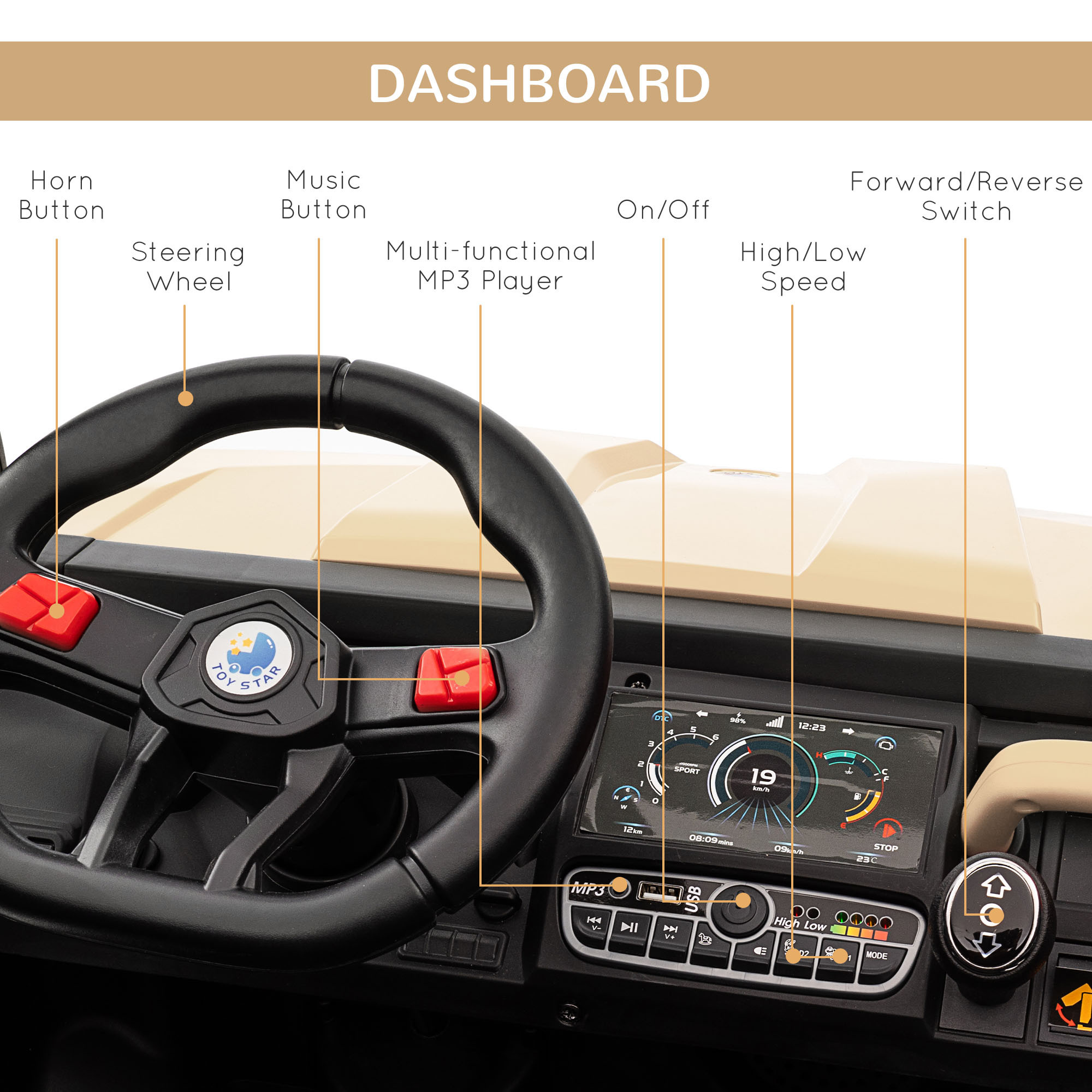 - Realistic: This kids ride on car includes a music player, LED headlights, viewing screen and a working horn – everything you'd expect in a real vehicle. Also includes a back bucket for children to keep toys.