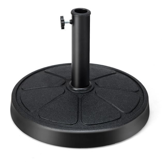 Perfect Partner for Your Patio Umbrella! This 45 cm round weighted umbrella base weighs 14 kg/31 lbs, providing solid support for your outdoor umbrella. And designed with 2 adapters of 38 mm and 48 mm/1.5" and 1.9" diameter, the umbrella stand is suitable for most 270 cm/9 ft market umbrellas and patio table umbrellas. More than that, this heavy-duty umbrella stand is made of premium resin material, which can endure outdoor environments without aging or fading, ensuring long-lasting durability. And with its exquisite pattern and classic black colors, this weighted umbrella base goes well with any decor theme.