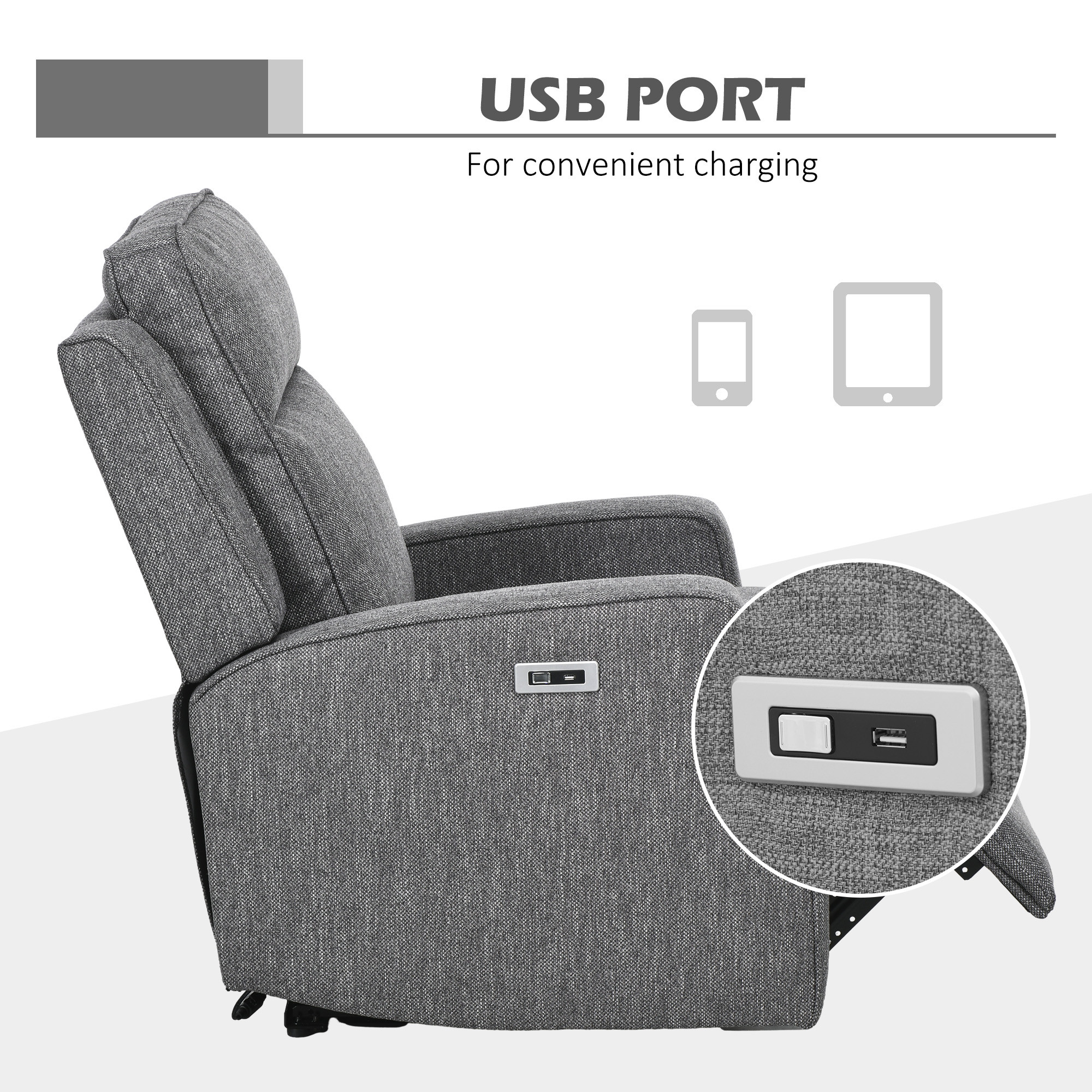 - USB charging port: Located on the armrest, charge your phone and other small appliances right to you on this recliner armchair.