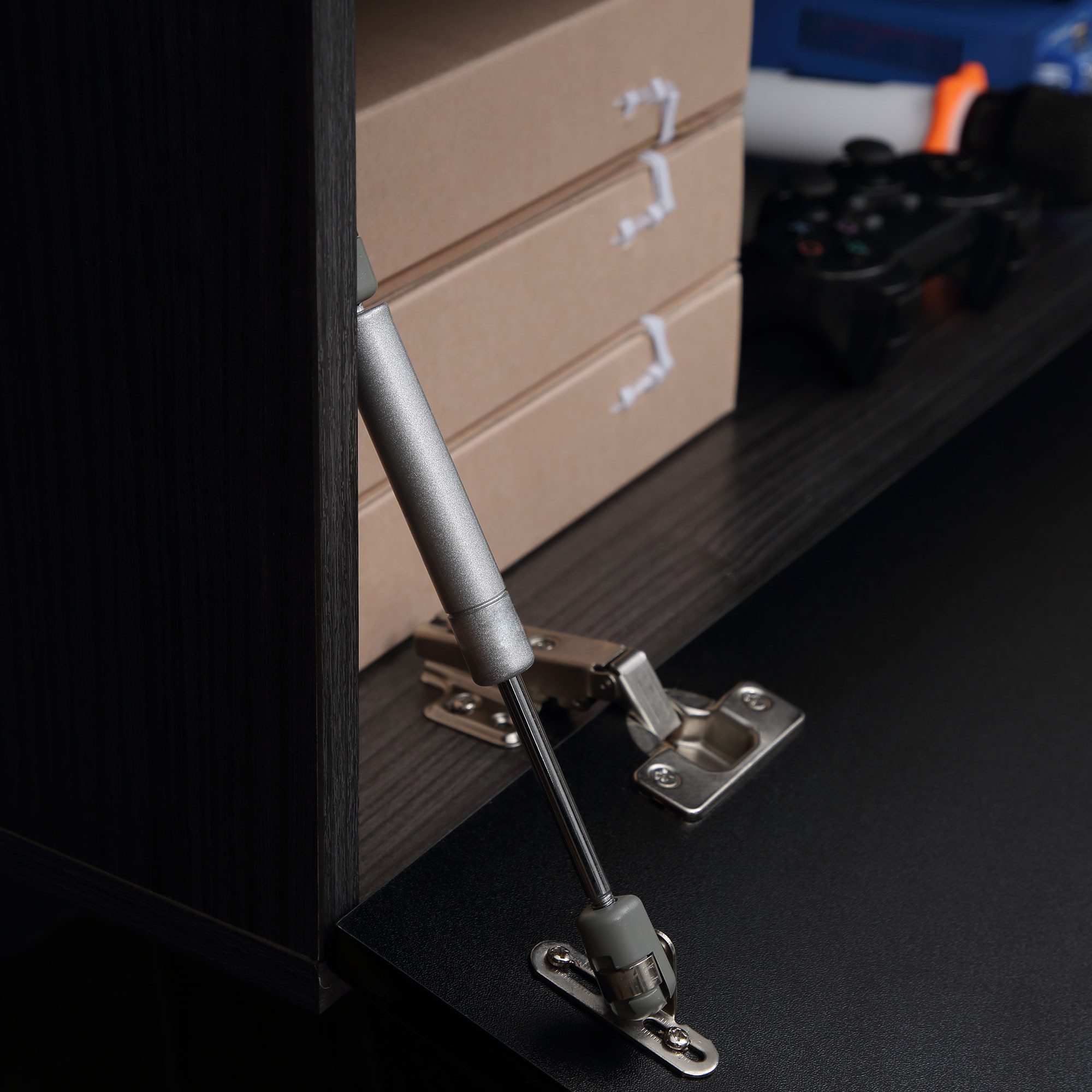 - High gloss door: Black shiny front on this TV table gives it a sleek, modern look. Looks great with the wood-effect body.