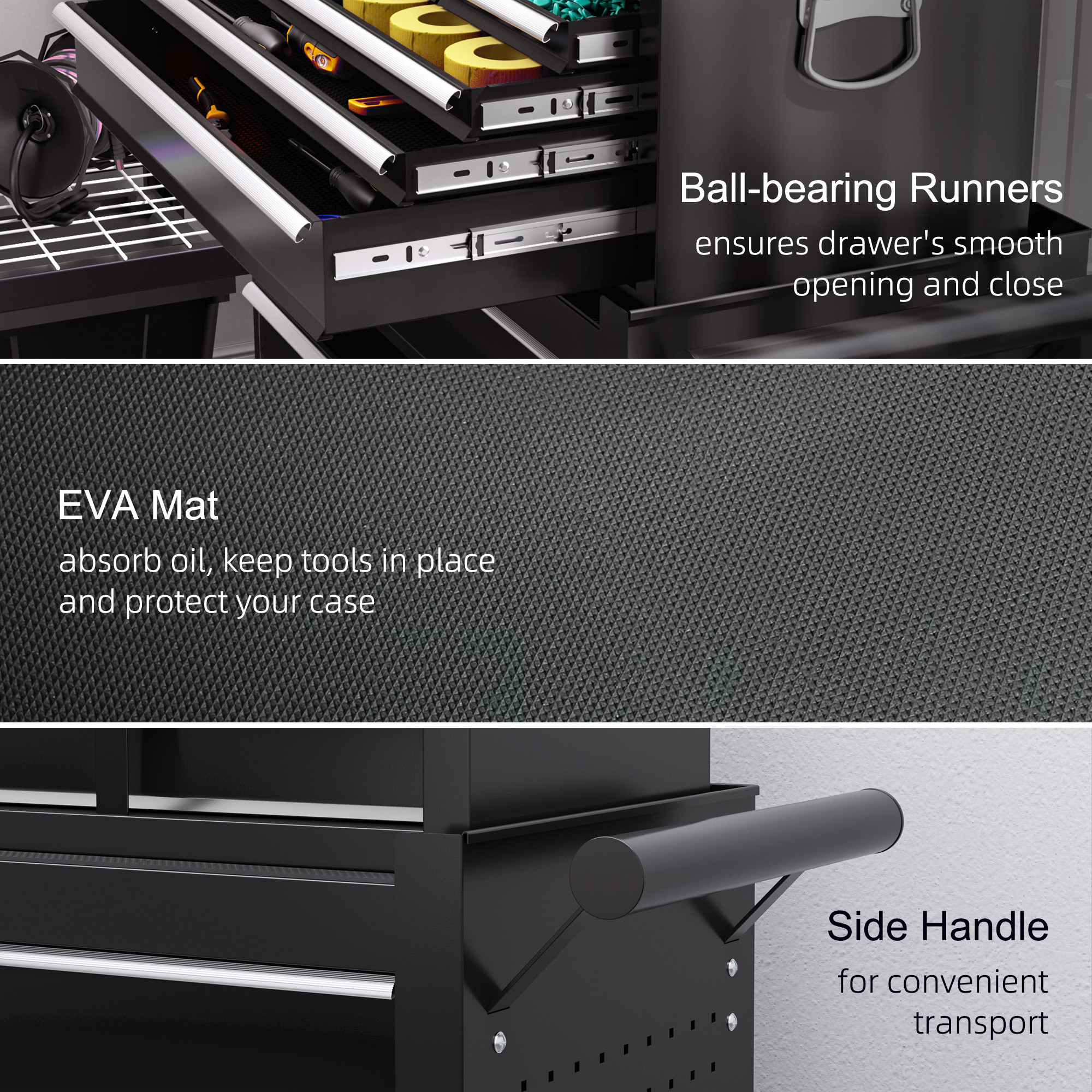 - Multi-storage design: Tool cabinet comes with 14 slide-out drawers, top storage area, five bottom drawers, side pegboard and a side rack. Ball bearing runners on drawers for smooth opening and closing.