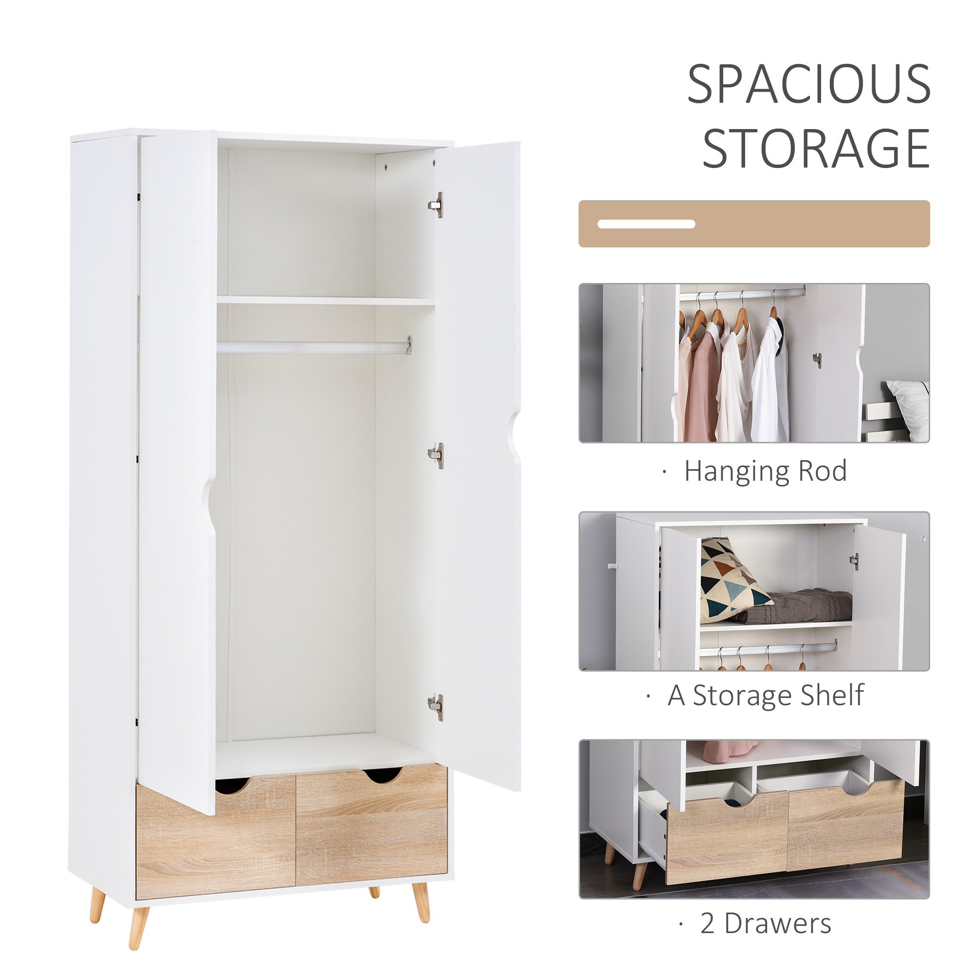 2-Door Clothes Wardrobe w/ Rail Shelf 2 Drawers Wood Feet Elegant Home Storage Organisation Furniture Dresses Coats Blankets Sho