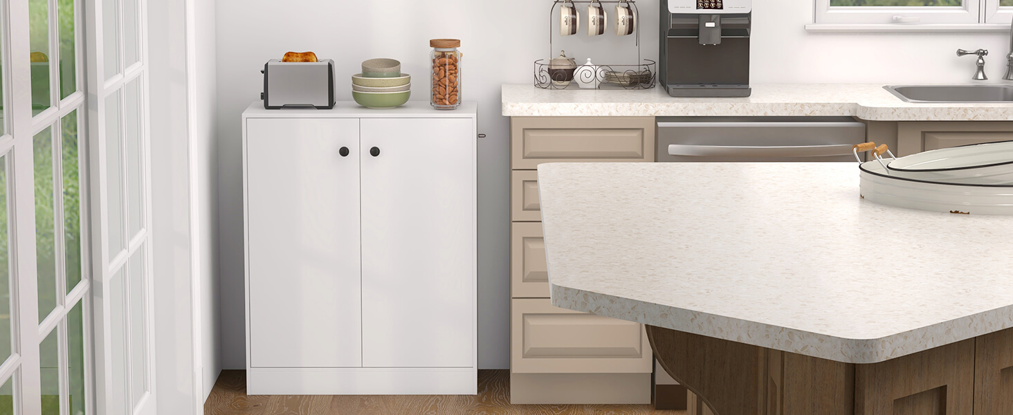 User-friendly Design: The convenient door knobs are fixed at a relatively higher position, which makes it easy for you to grab the knob to open the door without bending over. Plus, the cabinet doors are connected by premium metal hinges, which are flexible to assemble and smooth to use.
