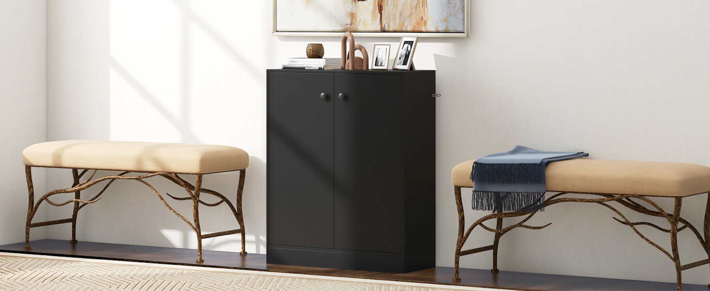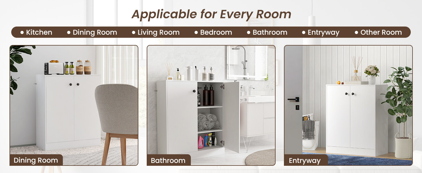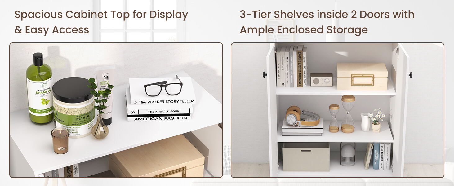 With a spacious tabletop and 3 interior storage shelves, the side cabinet holds the daily essentials close at hand and keep them from dust. What's more, comes with anti-toppling device, the floor cabinet is rather sturdy and safe for family use. You don't have to worry about there would be a falling accident to cause damage. Meanwhile, the simple and modern appearance adds charm, making the accent cabinet a versatile addition to various rooms. Don't miss this stylish and multifunctional cabinet!