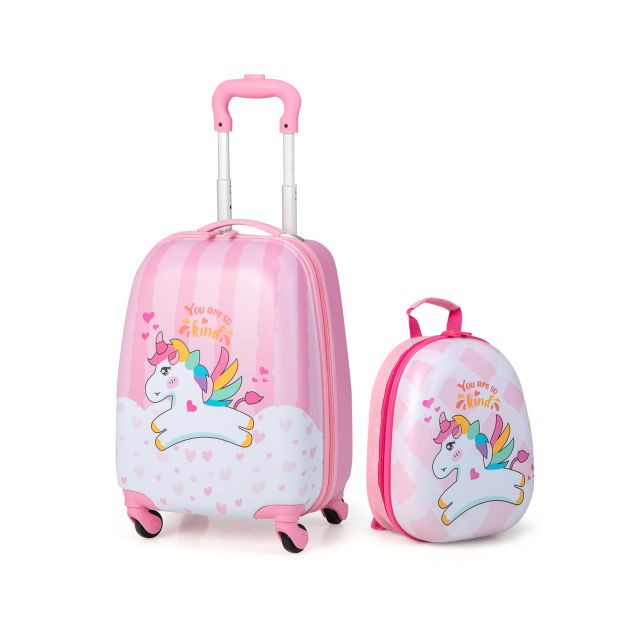 With a cute unicorn design, this children's luggage set includes a trolley suitcase, with multi-directional wheels and an ergonomically designed telescopic handle, and a backpack. The luggage set is light yet durable and thanks to the ABS material, the set has a smooth finished surface that is easy to clean. If you are looking for a set of children's luggage like this, don't hesitate to order now.