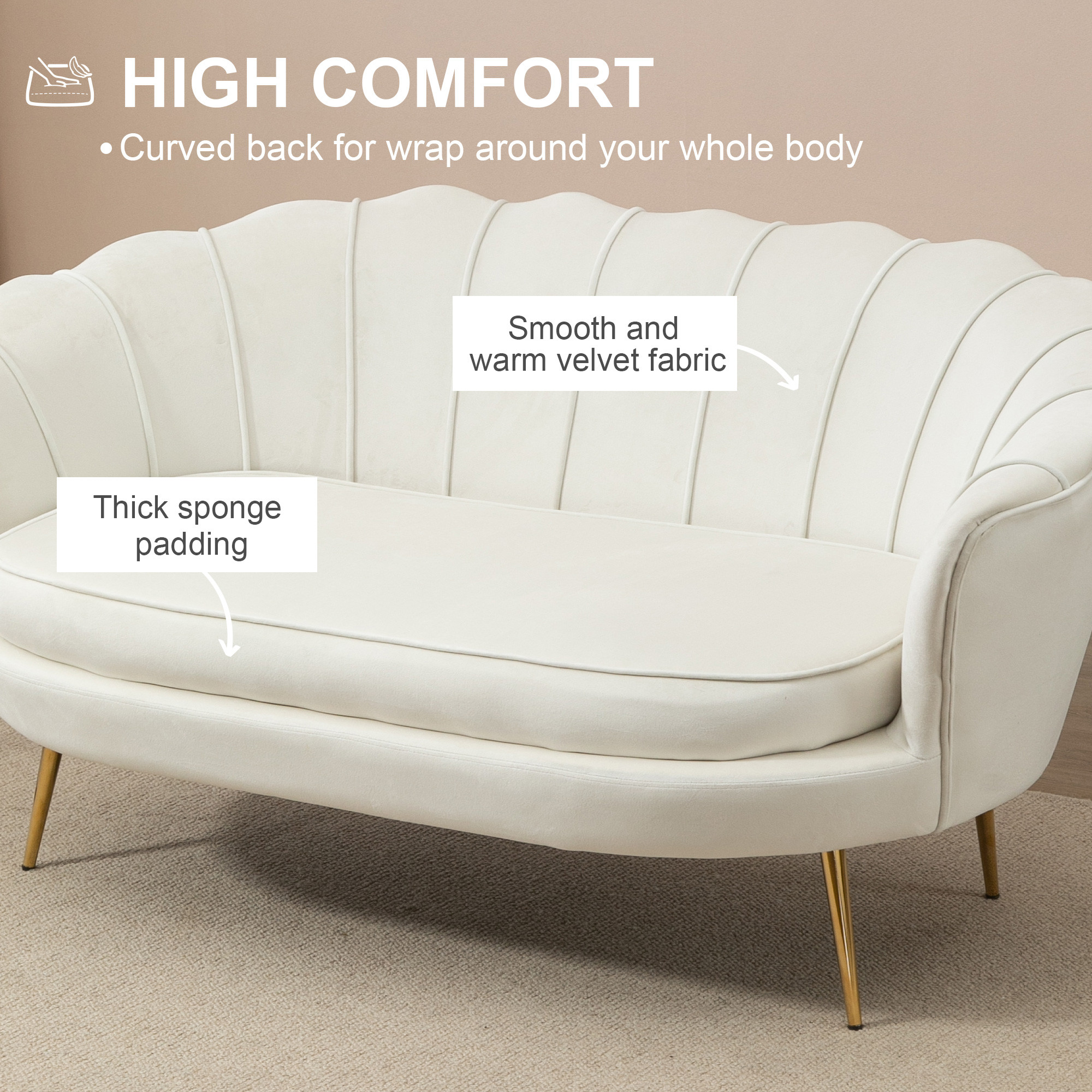- Elegant design: This two seater sofa features a graceful curved petal back like a flower, matching with the bright gold legs to add a touch of elegance to any rooms.