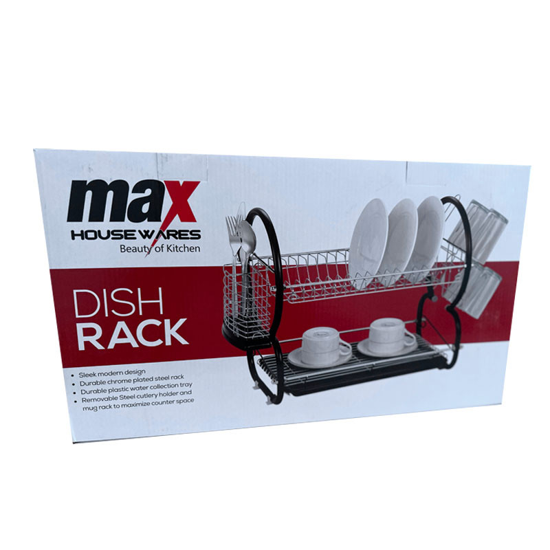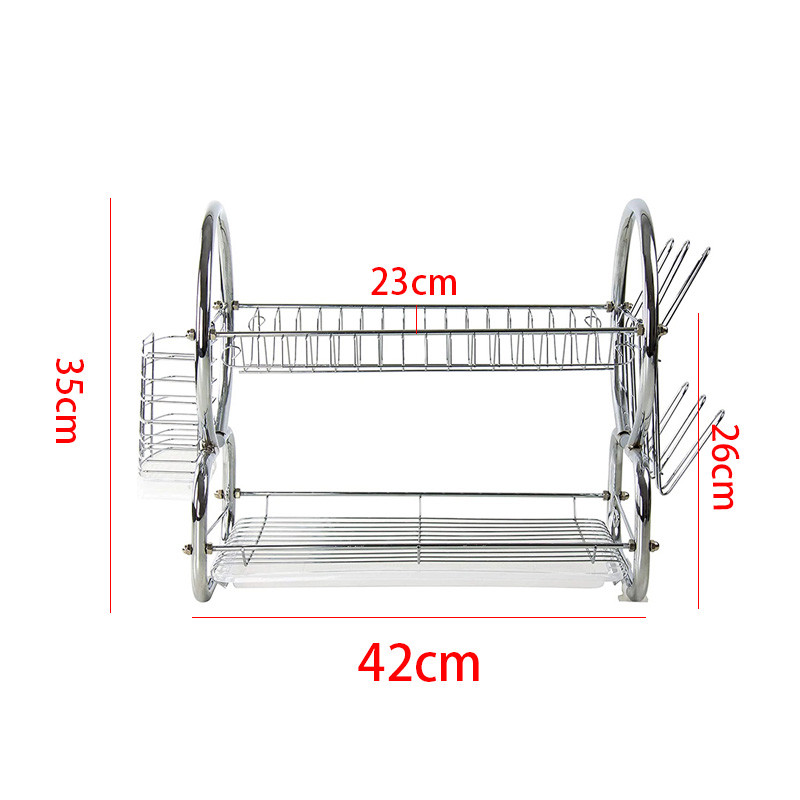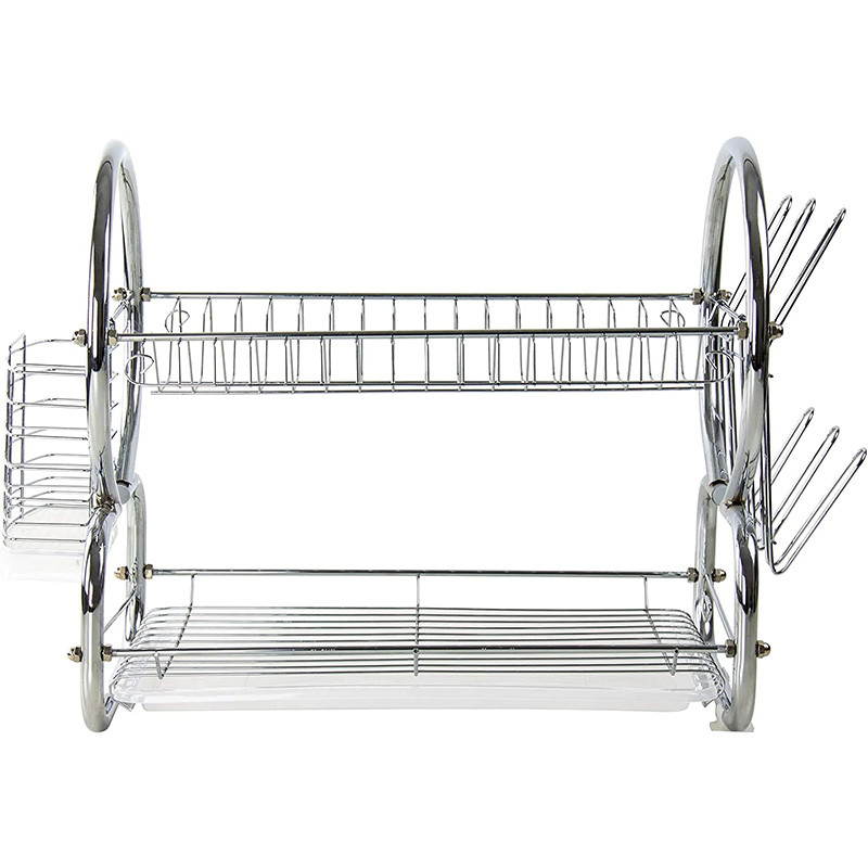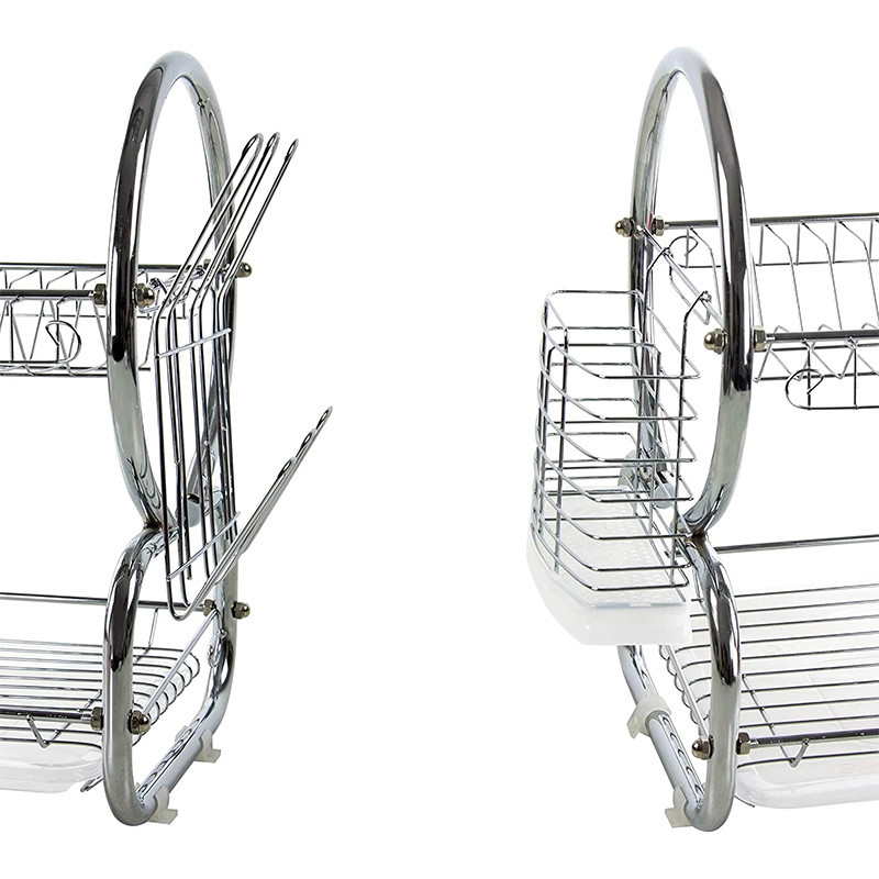 - The kithchen dish drainer rack is composed of 2 tier dish drying racks with drip tray, cutting board rack, cutlery holder. The 2-tier design saves more vertical space of kitchen countertop. It can hold plates, knives, coffee cups, glass, fruits, cutting board, spices; meets all your storage needs.
