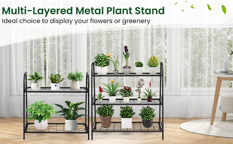 Steady and Durable Structure: Crafted of solid steel frame and rust-resistant powder-coated finish, this plant stand is stable enough and not easy to deform after long time use. Besides, slightly adjustable footpads adapt well to uneven ground and protect the floor from being scratched.