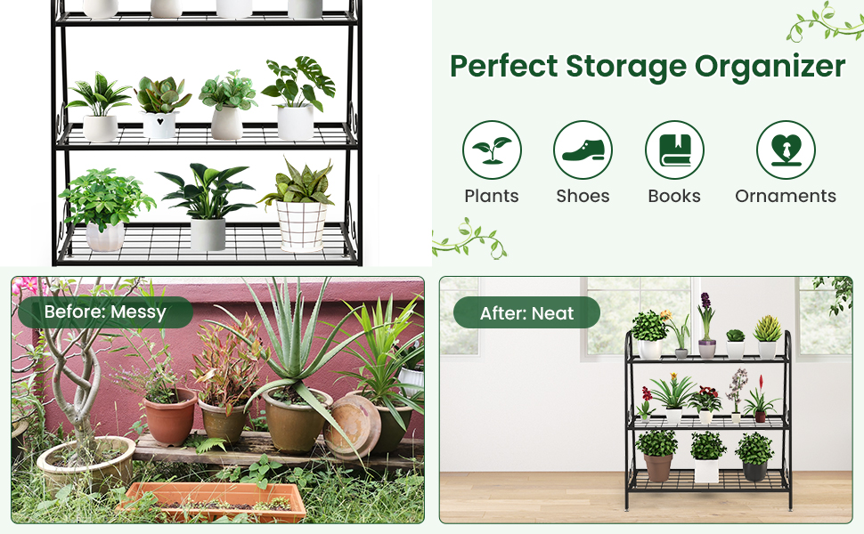 Versatile Displaying Rack: In addition to the flower rack, this plant stand also can be used as a bookcase, display shelf, shoe rack or living room organizer. Two open shelves allow you to appreciate flowers and take items conveniently.