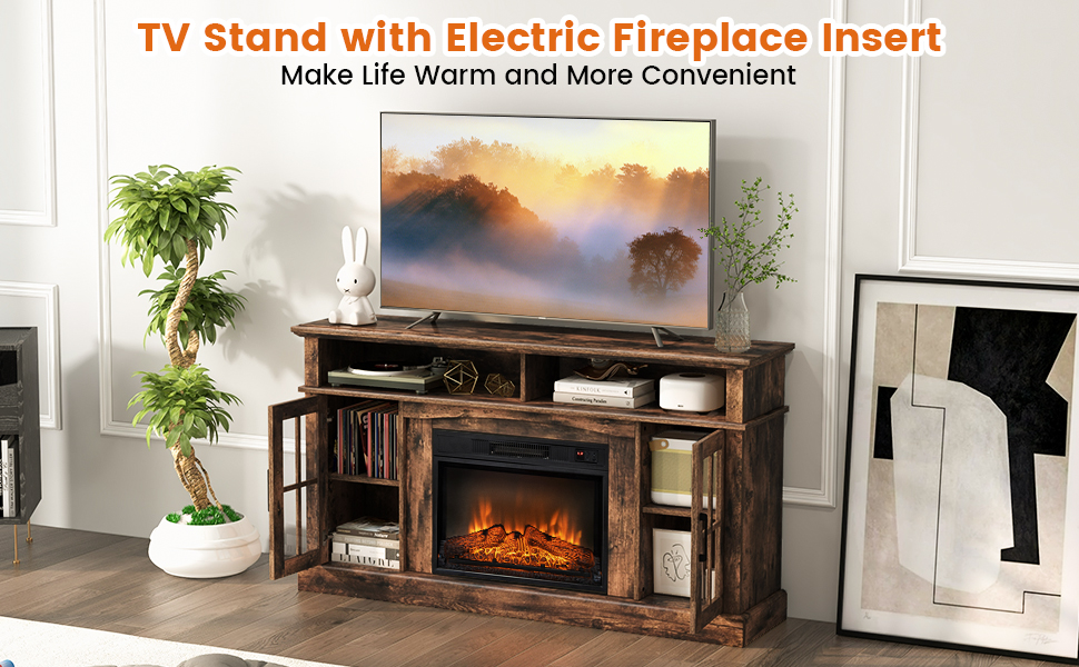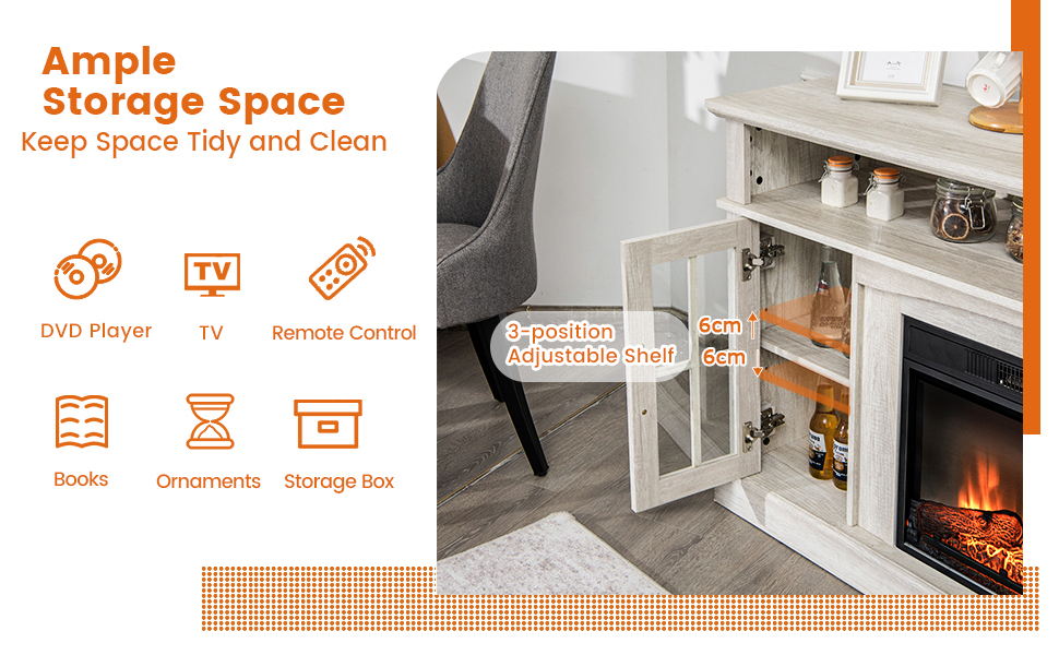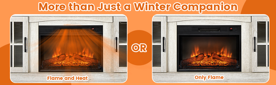 Combining heating and practicality as one, this fireplace TV stand will be the perfect choice for you! This entertainment center with 2 cable manage holes fit for TVs up to 65”. At the same time, it provides spacious storage space for various items thanks to the large table, 2 open storage compartments and 2-door cabinets with 3-position adjustable middle shelves. What’s more, if you use the control panel or handy remote control open the electric fireplace and set the suitable temperature (17℃-27℃), it is able to heat up 161 square feet with 4650 BTU. And you are able to set the time from 30 minutes to 6 hours through timer control. Moreover, the constant temperature design brings uninterrupted warmth. In addition to winter, the electric fireplace is ready for other 3 seasons, because the 3D realistic flame effect can be used independently. The anti-tipping device on the TV stand and the overheat protection for electric place protect you while using it.