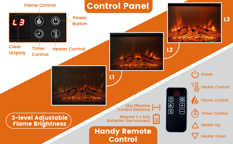 2 Ways to Use and Control: The 3D realistic flame effect with 3-level adjustable brightness that can be operated with or without heat, creating a warm atmosphere all year around. And the convenient control panel and included remote control (33 ft effective control distance) allow you to control the electric fireplace easily.