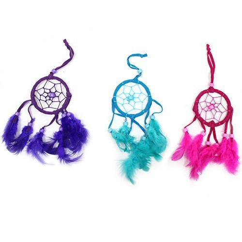 This hand crafted dream catcher features 6.5 cm wooden round hand wrapped in turquoise, pink and purple suede cord, followed by six 7 cm long same coloured feathers hanged on suede cords. The heart features same colour strings with small bead in the centre.