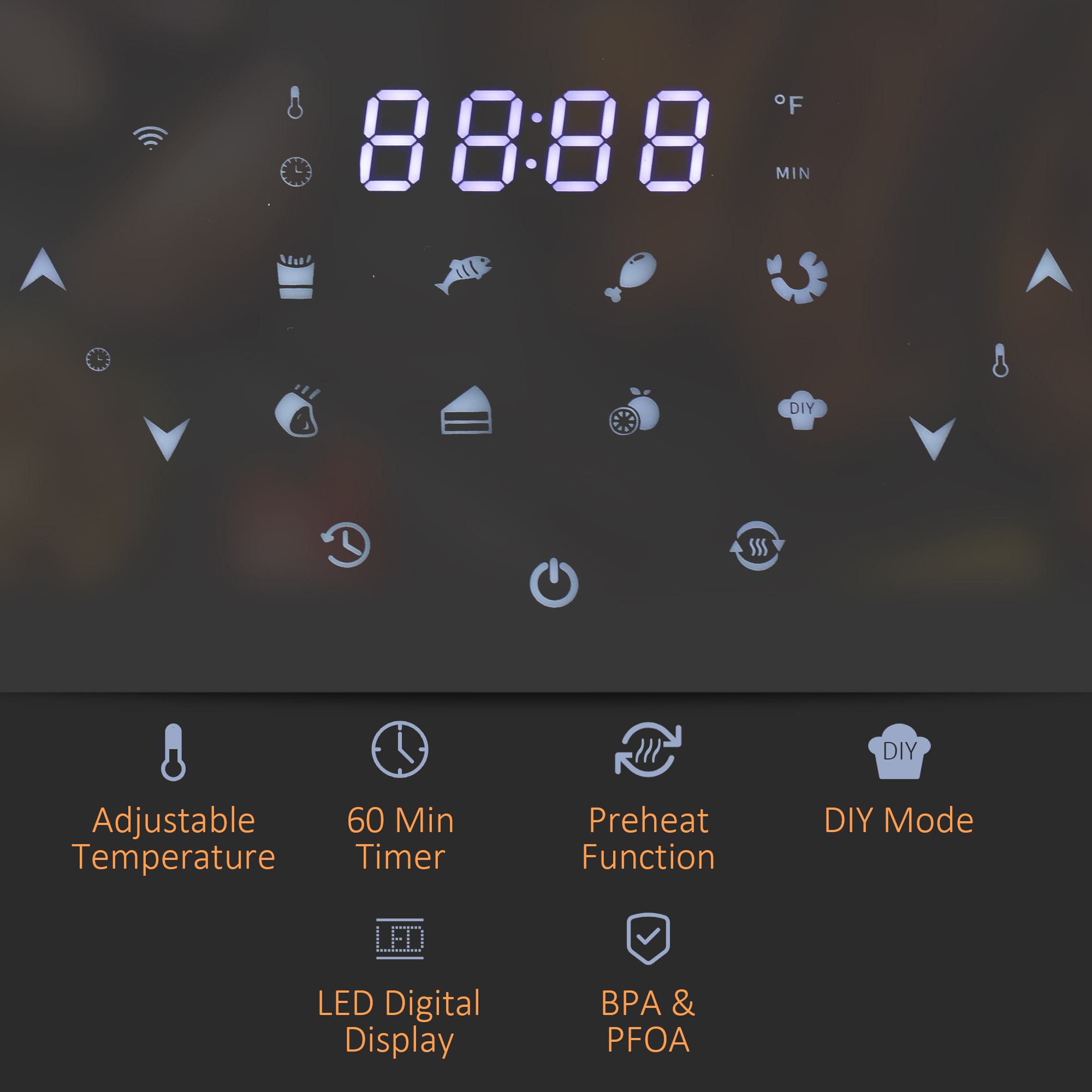 - DIY Your Food: By using autonomous mode, you can easily control the temperature from 80℃-200℃ and time from 0 to 60 minutes. And automatic power off function ensures the safety. Furthermore, a LED display switches between temperature and time remaining.
