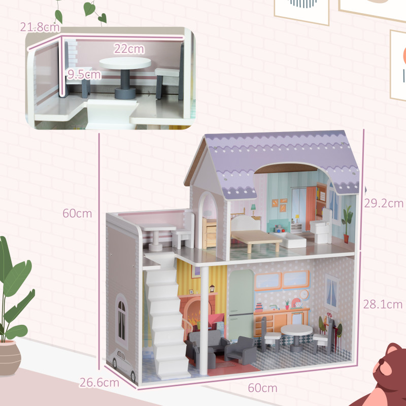 - Compact and colourful: This 60cm high dollhouse features a modern, fully furnished two-level design with a balcony. Great for tabletop play, it sparks your child's imagination with their favourite toy dolls.