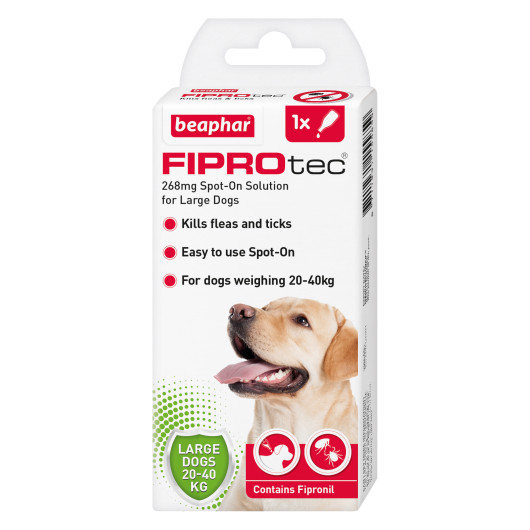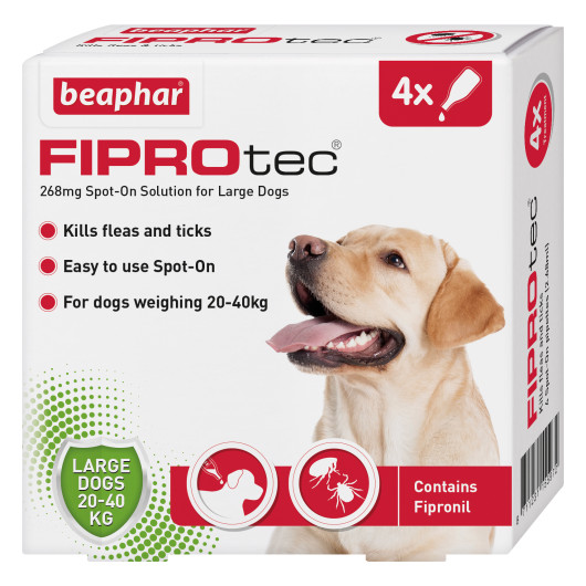 Beaphar FIPROtec® Spot-On for Large Dogs is an effective and affordable veterinary strength medicine to control fleas and ticks on your dog. Containing the well-known active ingredient fipronil, Beaphar FIPROtec® Spot-On for Large Dogs effectively kills fleas for up to five weeks and kills ticks for up to four weeks.