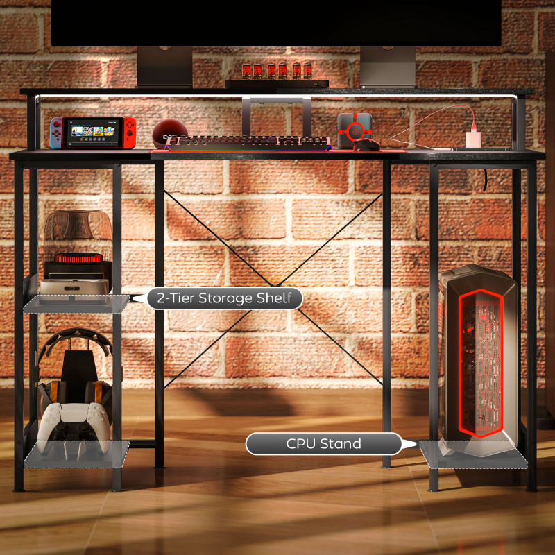 Computer Desk with Power Outlets and LED Lights, 120 x 50cm Reversible Home Office Desk with Monitor Stand and 2-Tier Storage Sh