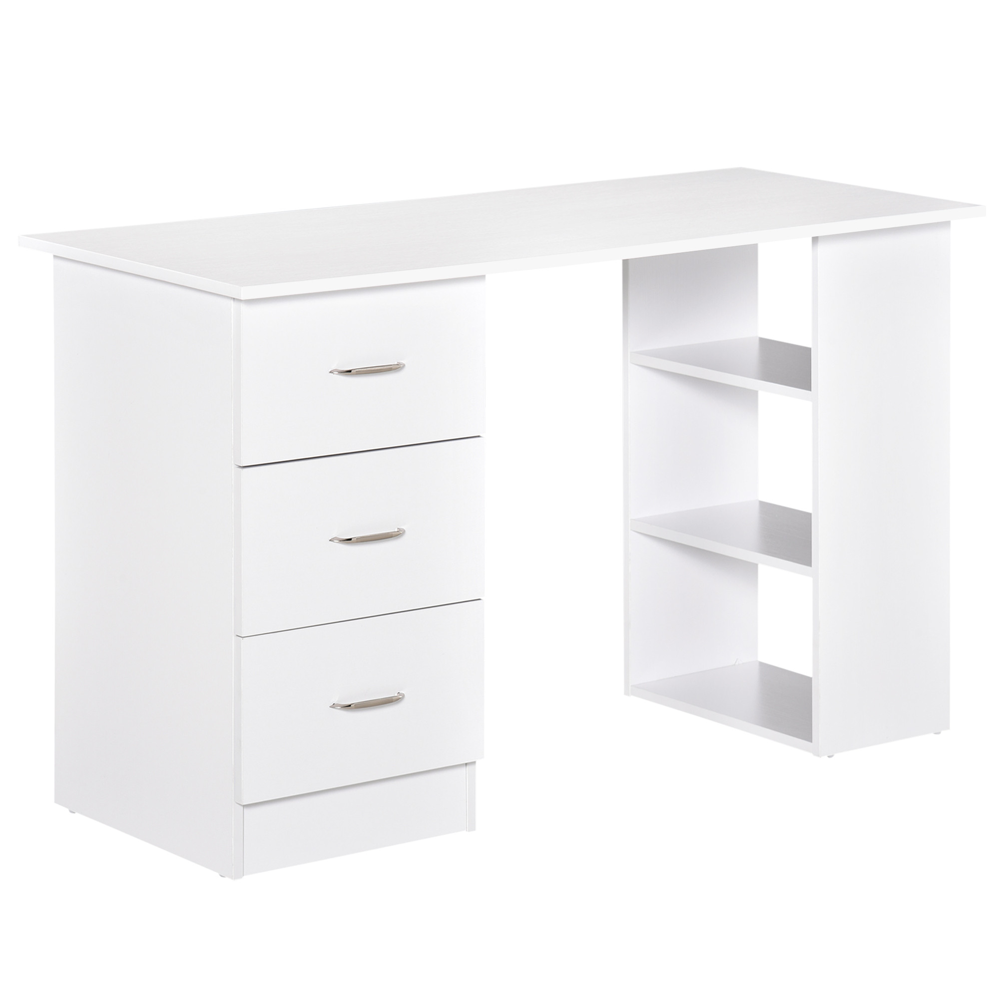 Computer Desk, Writing Table, PC Workstation with 3 Storage Shelves and Drawers, Silver Handle, for Home Office, White